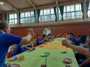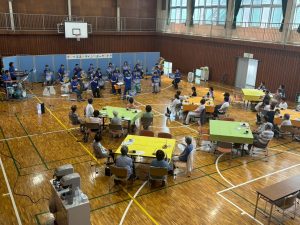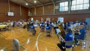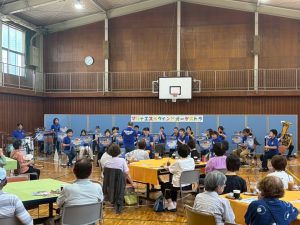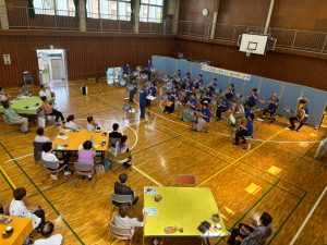 座ったままできる体操で演奏に合わせて一緒に体を動かしました。
